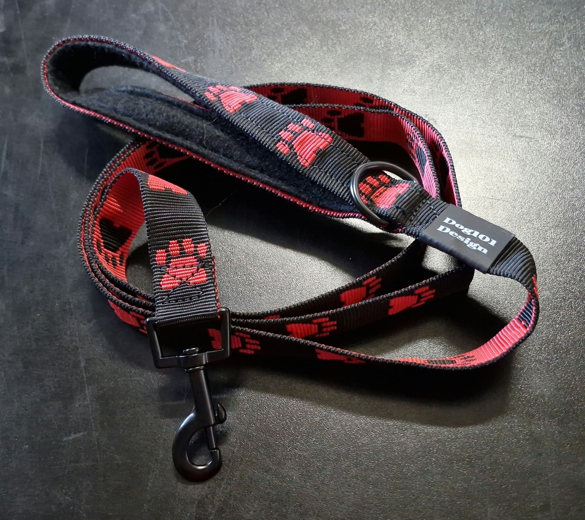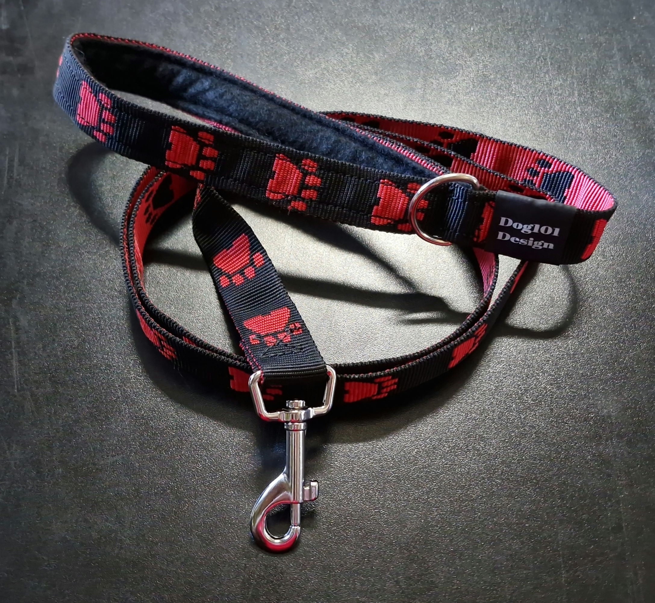 Adult Dog Premium Handle Fancy Red Paw - Black 1.5m x 25mm Lead