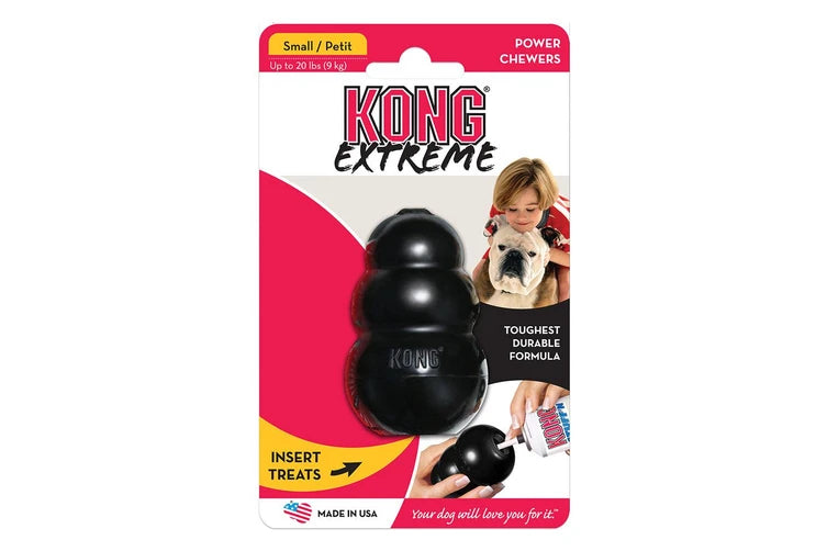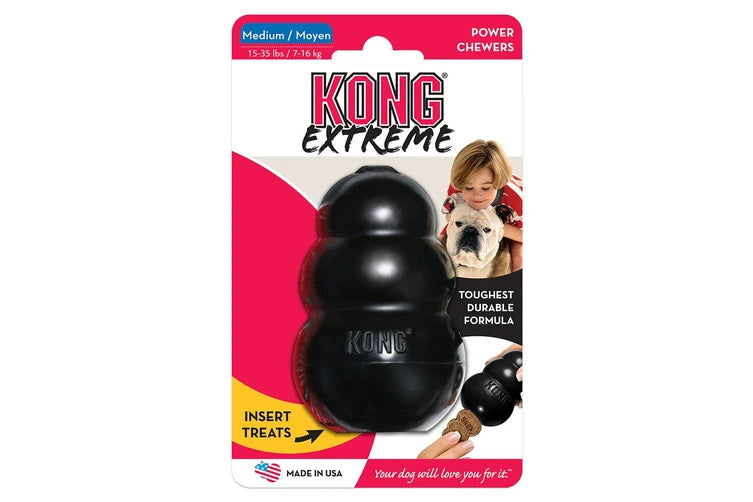 The KONG Extreme dog toy represents the most durable strength of KONG rubber. Designed for the toughest of chewers, the KONG Extreme offers enrichment and helps satisfy dogs’ instinctual needs. The KONG unique, ultra-durable, natural rubber formula is designed for determined chewers, while the erratic bounce fulfills a dog’s need to play. Want to extend play time? Be sure to stuff with tempting bits of kibble and entice with a dash of peanut butter. Add to the fun by adding KONG Snacks and top with KONG Easy Treat. Stuff and Freeze for a longer-lasting challenge.