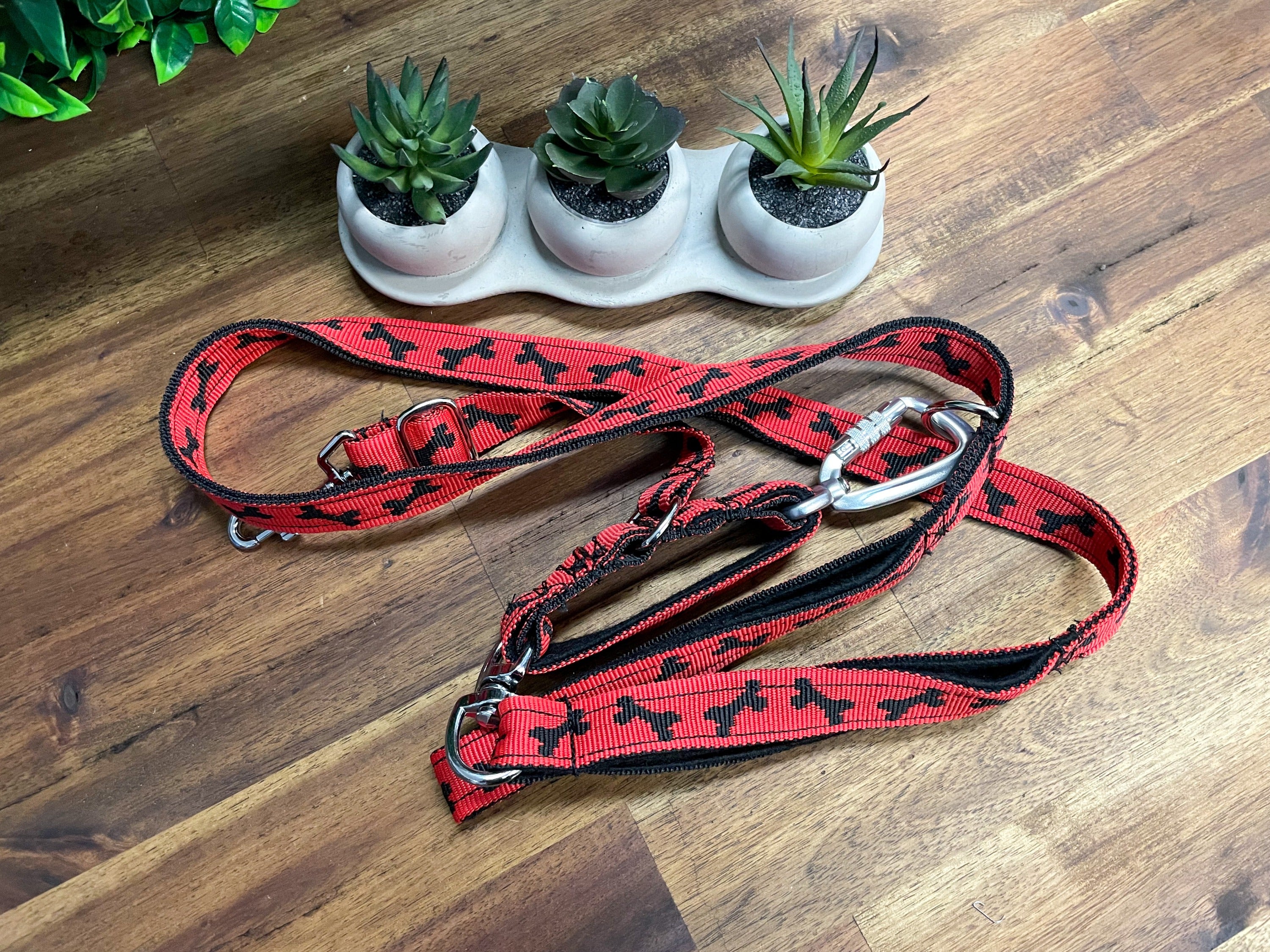 Our Dog101 Design reactive lead is designed to give you control and help when you need it.  The main clip is a screw locking clip so you cannot accidentally undo it.  It is connected to a swivel so the first point cannot twist at the halter or training device.  There is a second attachment which can than be shortened or extended to reach harnesses or collars so that you always have 2 different points of connection.  There is the first felt lined handle close to the end for large dogs.  From here a swivel is attached just in case your dog loses it and spins around so the lead does not wrap around your hand.  Above this is a felt lined handle so you can get low down control on the lead.  At the end of the lead is a D ring and another felt lined handle.  These are made in Brisbane and designed based on how we train reactive dogs for clients to get control quickly and safely, or for those who want the extra safety of being extra connected. 1.5M long or 0.9M Long