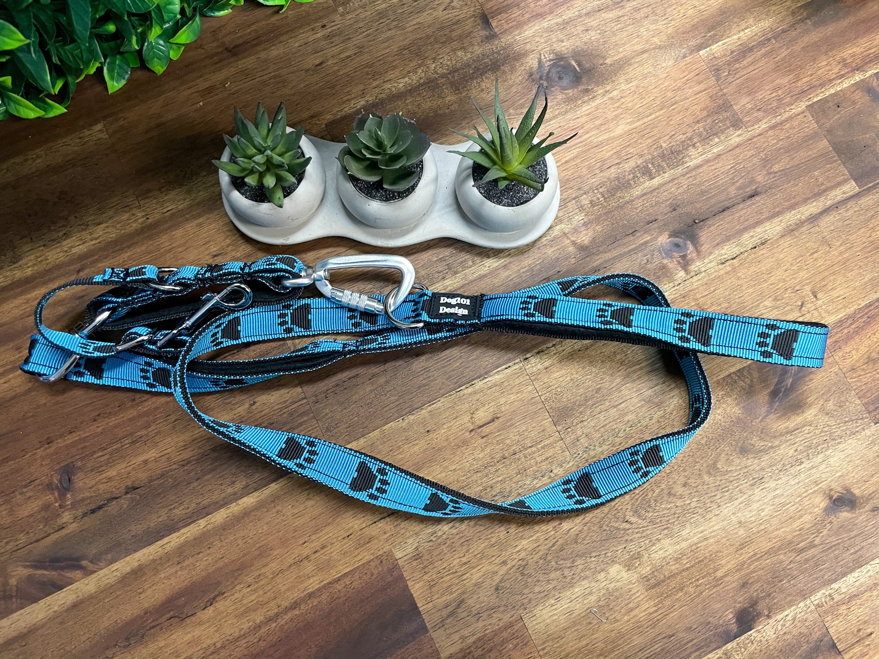 Our Dog101 Design reactive lead is designed to give you control and help when you need it.  The main clip is a screw locking clip so you cannot accidentally undo it.  It is connected to a swivel so the first point cannot twist at the halter or training device.  There is a second attachment which can than be shortened or extended to reach harnesses or collars so that you always have 2 different points of connection.  There is the first felt lined handle close to the end for large dogs.  From here a swivel is attached just in case your dog loses it and spins around so the lead does not wrap around your hand.  Above this is a felt lined handle so you can get low down control on the lead.  At the end of the lead is a D ring and another felt lined handle.  These are made in Brisbane and designed based on how we train reactive dogs for clients to get control quickly and safely, or for those who want the extra safety of being extra connected. 1.5M long or 0.9M Long