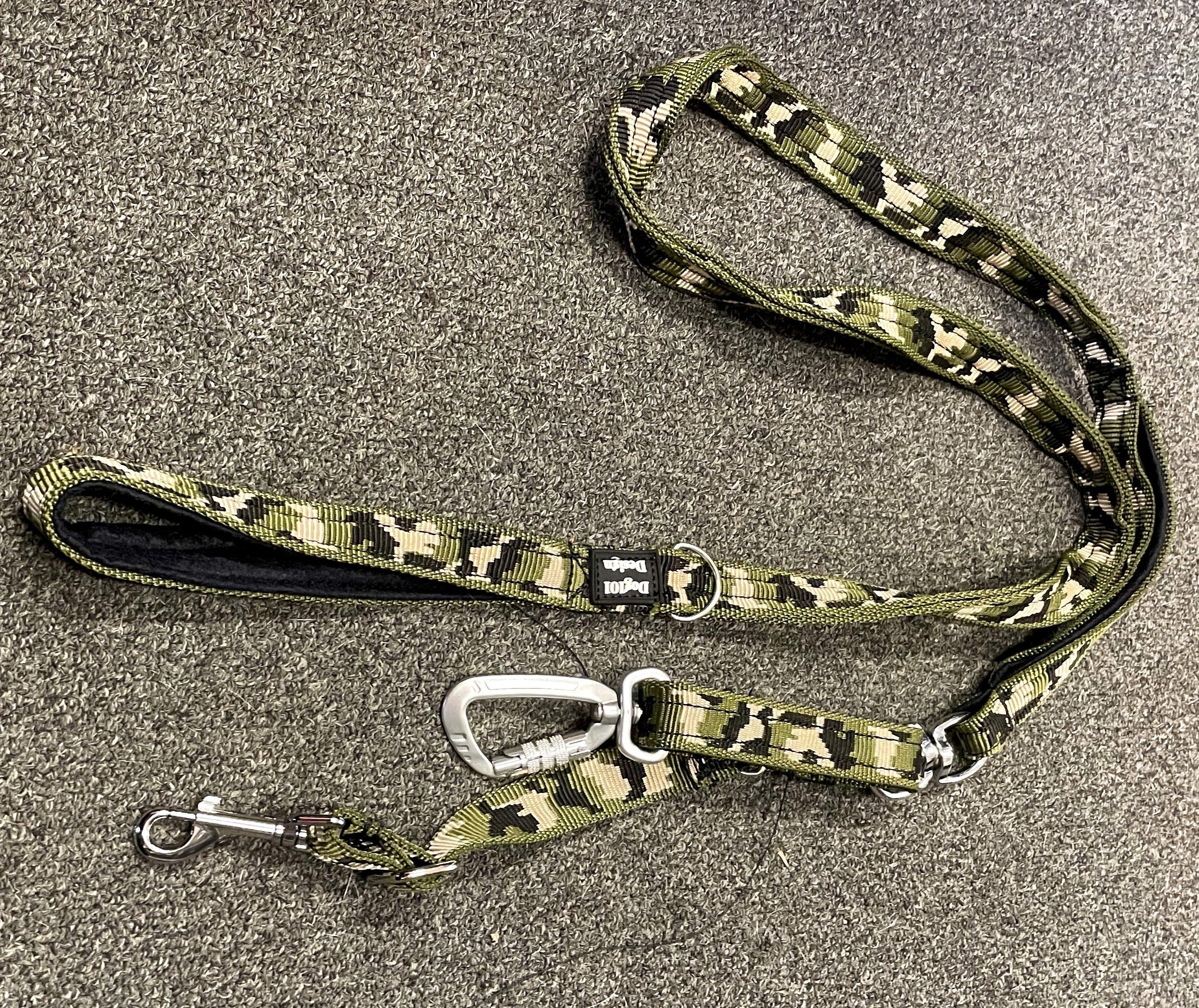 Our Dog101 Design reactive lead is designed to give you control and help when you need it.  The main clip is a screw locking clip so you cannot accidentally undo it.  It is connected to a swivel so the first point cannot twist at the halter or training device.  There is a second attachment which can than be shortened or extended to reach harnesses or collars so that you always have 2 different points of connection.  There is the first felt lined handle close to the end for large dogs.  From here a swivel is attached just in case your dog loses it and spins around so the lead does not wrap around your hand.  Above this is a felt lined handle so you can get low down control on the lead.  At the end of the lead is a D ring and another felt lined handle.  These are made in Brisbane and designed based on how we train reactive dogs for clients to get control quickly and safely, or for those who want the extra safety of being extra connected. 1.5M long or 0.9M Long