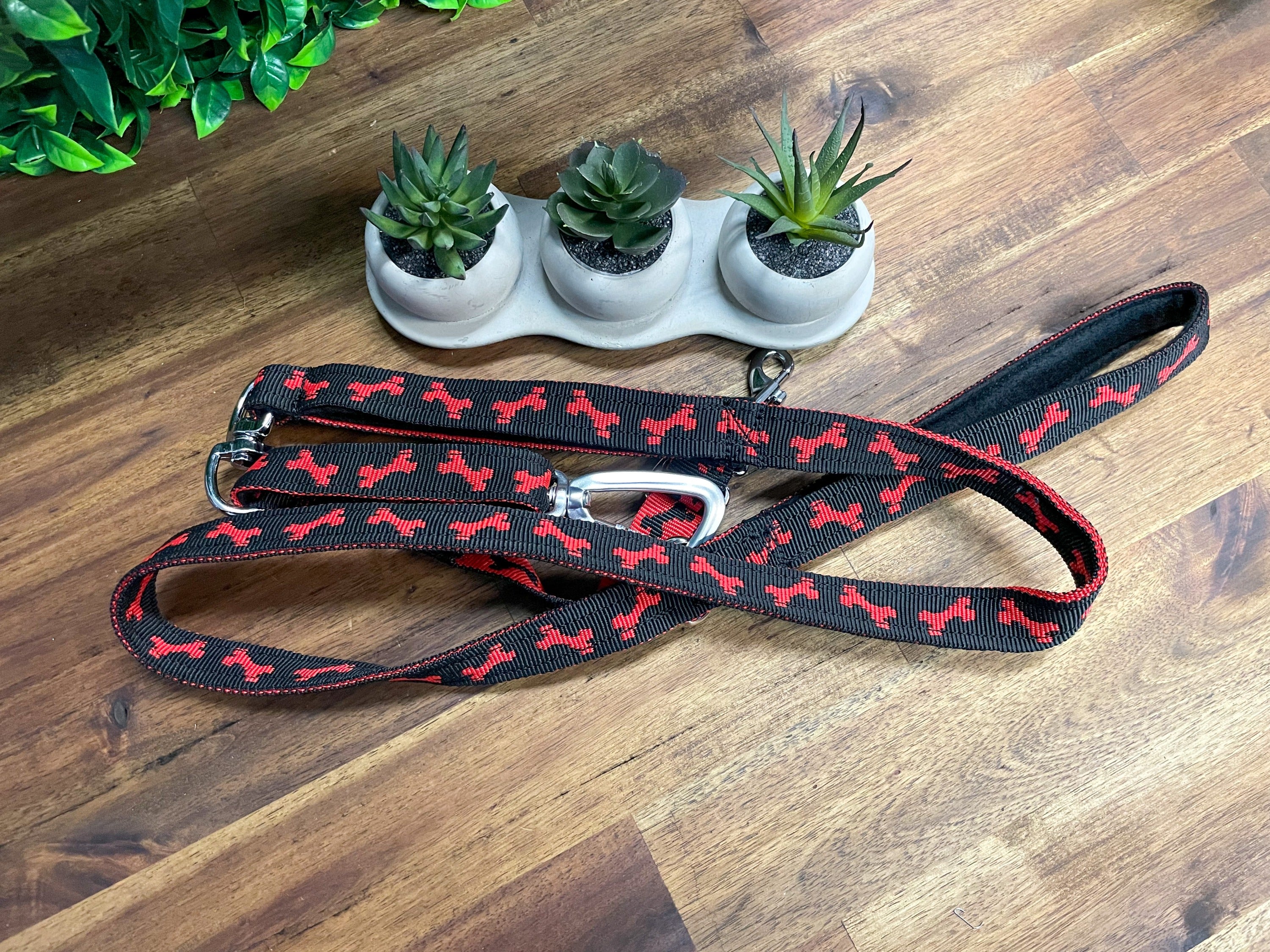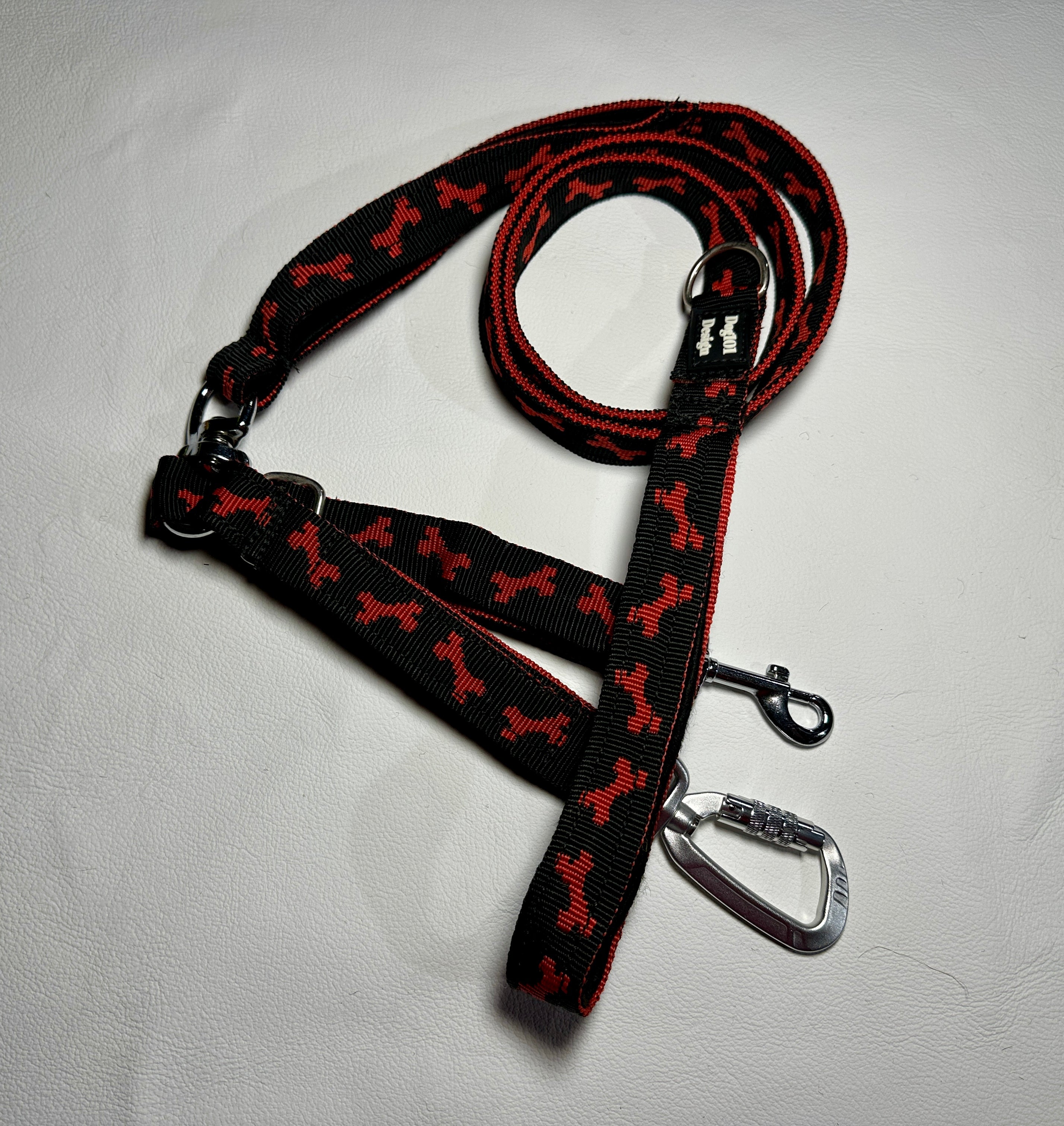 Our Dog101 Design reactive lead is designed to give you control and help when you need it.  The main clip is a screw locking clip so you cannot accidentally undo it.  It is connected to a swivel so the first point cannot twist at the halter or training device.  There is a second attachment which can than be shortened or extended to reach harnesses or collars so that you always have 2 different points of connection.  There is the first felt lined handle close to the end for large dogs.  From here a swivel is attached just in case your dog loses it and spins around so the lead does not wrap around your hand.  Above this is a felt lined handle so you can get low down control on the lead.  At the end of the lead is a D ring and another felt lined handle.  These are made in Brisbane and designed based on how we train reactive dogs for clients to get control quickly and safely, or for those who want the extra safety of being extra connected. 1.5M long or 0.9M Long