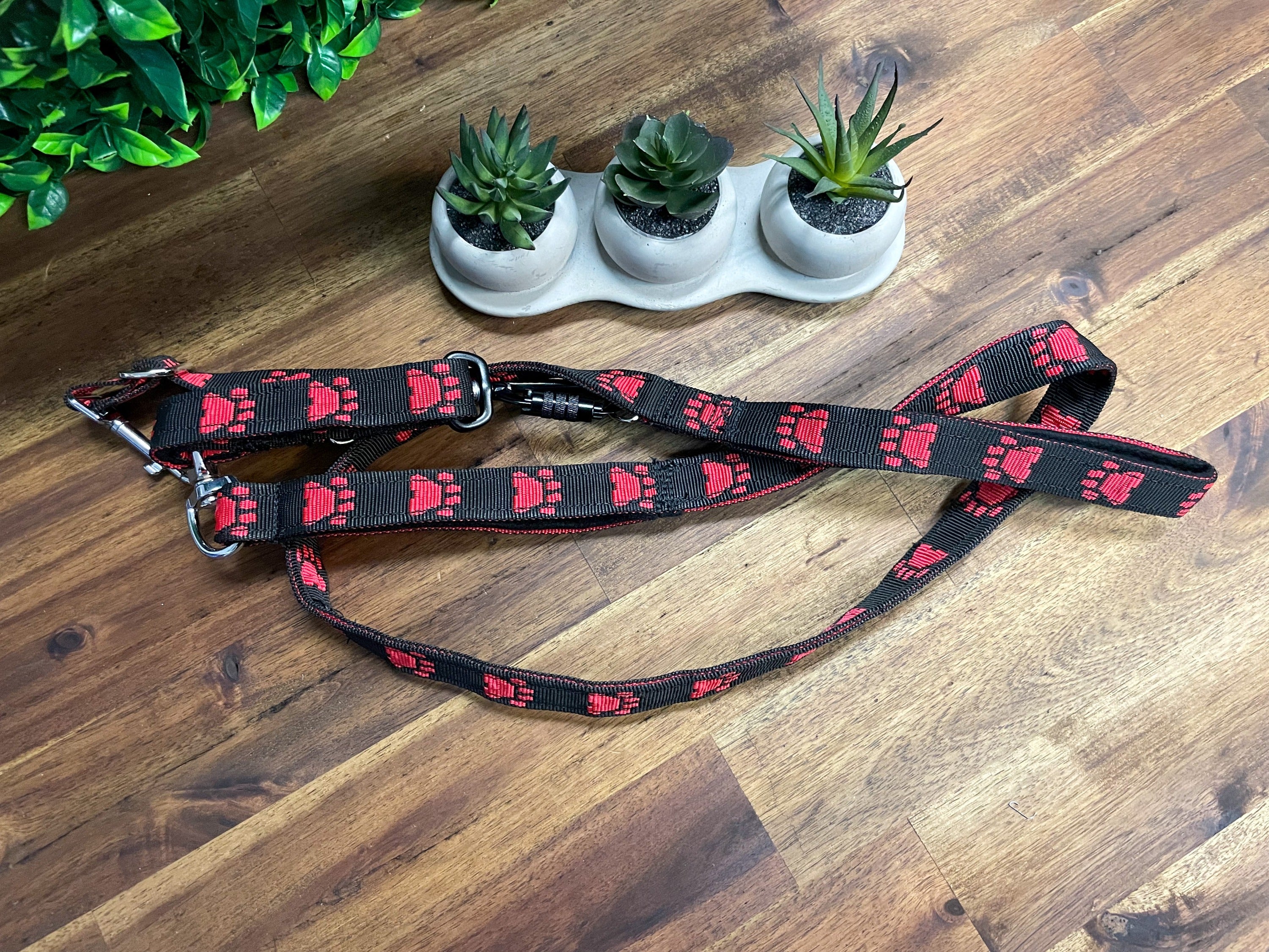 Our Dog101 Design reactive lead is designed to give you control and help when you need it.  The main clip is a screw locking clip so you cannot accidentally undo it.  It is connected to a swivel so the first point cannot twist at the halter or training device.  There is a second attachment which can than be shortened or extended to reach harnesses or collars so that you always have 2 different points of connection.  There is the first felt lined handle close to the end for large dogs.  From here a swivel is attached just in case your dog loses it and spins around so the lead does not wrap around your hand.  Above this is a felt lined handle so you can get low down control on the lead.  At the end of the lead is a D ring and another felt lined handle.  These are made in Brisbane and designed based on how we train reactive dogs for clients to get control quickly and safely, or for those who want the extra safety of being extra connected. 1.5M long or 0.9M Long