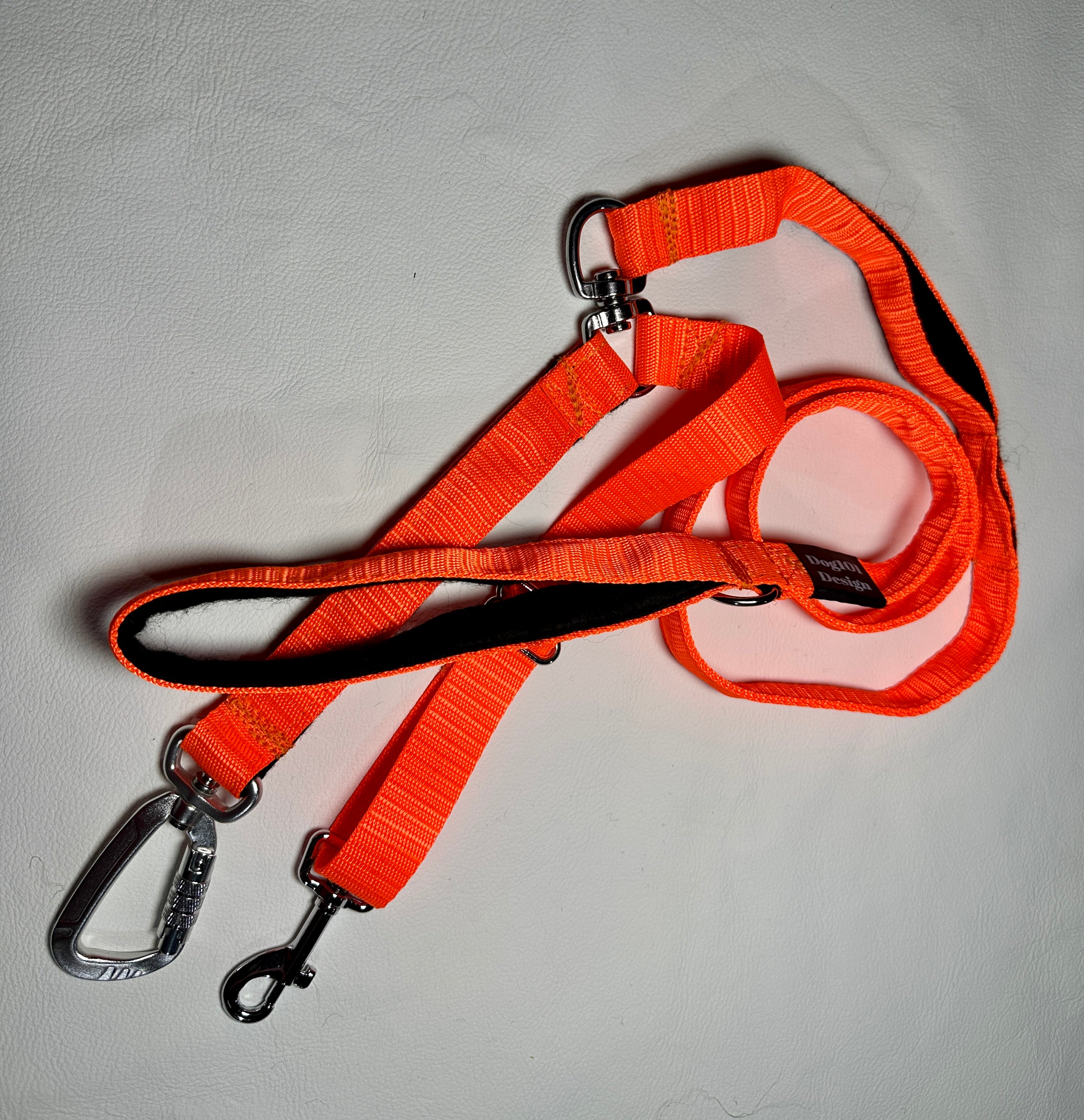 Our Dog101 Design reactive lead is designed to give you control and help when you need it.  The main clip is a screw locking clip so you cannot accidentally undo it.  It is connected to a swivel so the first point cannot twist at the halter or training device.  There is a second attachment which can than be shortened or extended to reach harnesses or collars so that you always have 2 different points of connection.  There is the first felt lined handle close to the end for large dogs.  From here a swivel is attached just in case your dog loses it and spins around so the lead does not wrap around your hand.  Above this is a felt lined handle so you can get low down control on the lead.  At the end of the lead is a D ring and another felt lined handle.  These are made in Brisbane and designed based on how we train reactive dogs for clients to get control quickly and safely, or for those who want the extra safety of being extra connected. 1.5M long or 0.9M Long