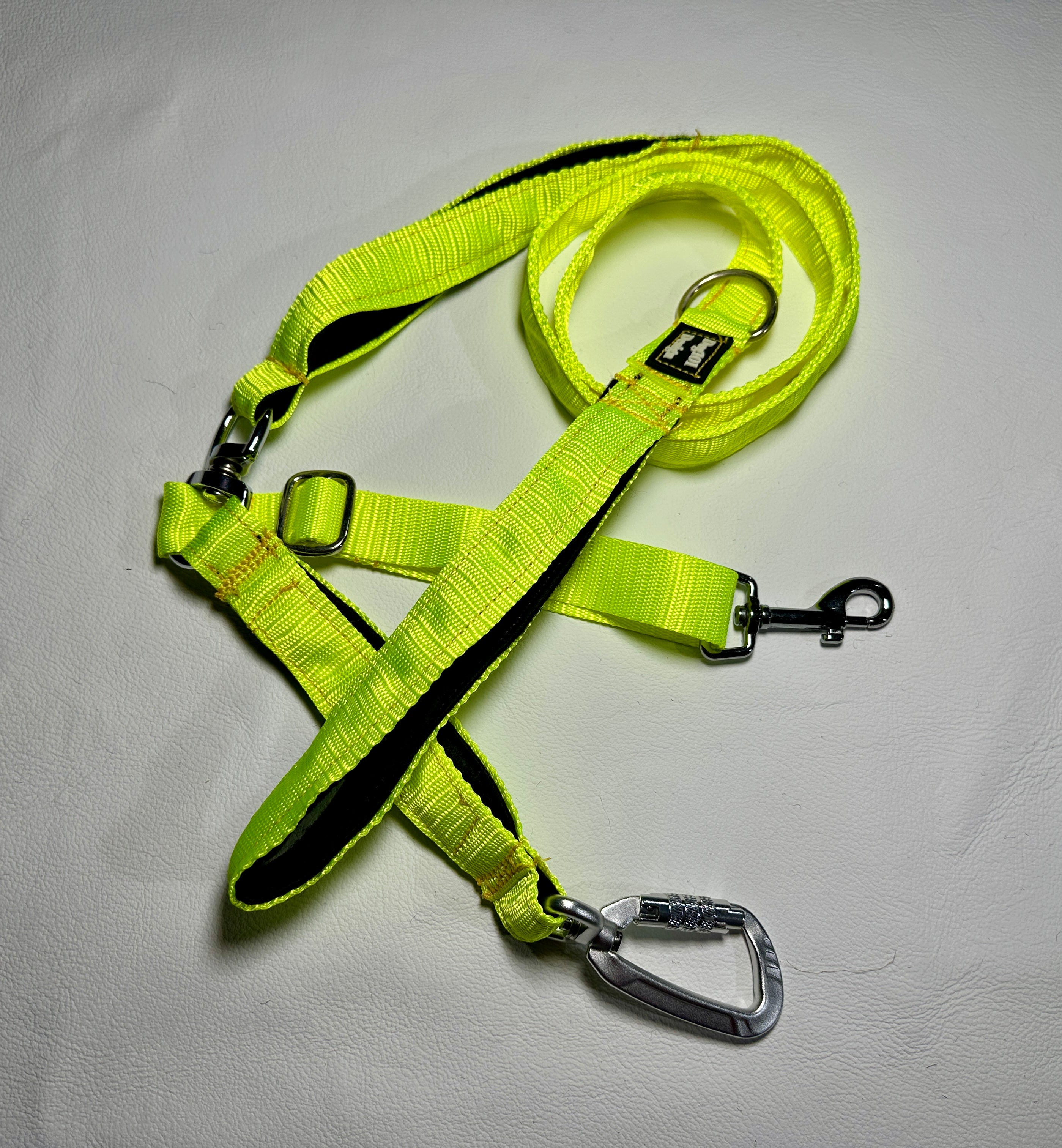 Our Dog101 Design reactive lead is designed to give you control and help when you need it.  The main clip is a screw locking clip so you cannot accidentally undo it.  It is connected to a swivel so the first point cannot twist at the halter or training device.  There is a second attachment which can than be shortened or extended to reach harnesses or collars so that you always have 2 different points of connection.  There is the first felt lined handle close to the end for large dogs.  From here a swivel is attached just in case your dog loses it and spins around so the lead does not wrap around your hand.  Above this is a felt lined handle so you can get low down control on the lead.  At the end of the lead is a D ring and another felt lined handle.  These are made in Brisbane and designed based on how we train reactive dogs for clients to get control quickly and safely, or for those who want the extra safety of being extra connected. 1.5M long or 0.9M Long
