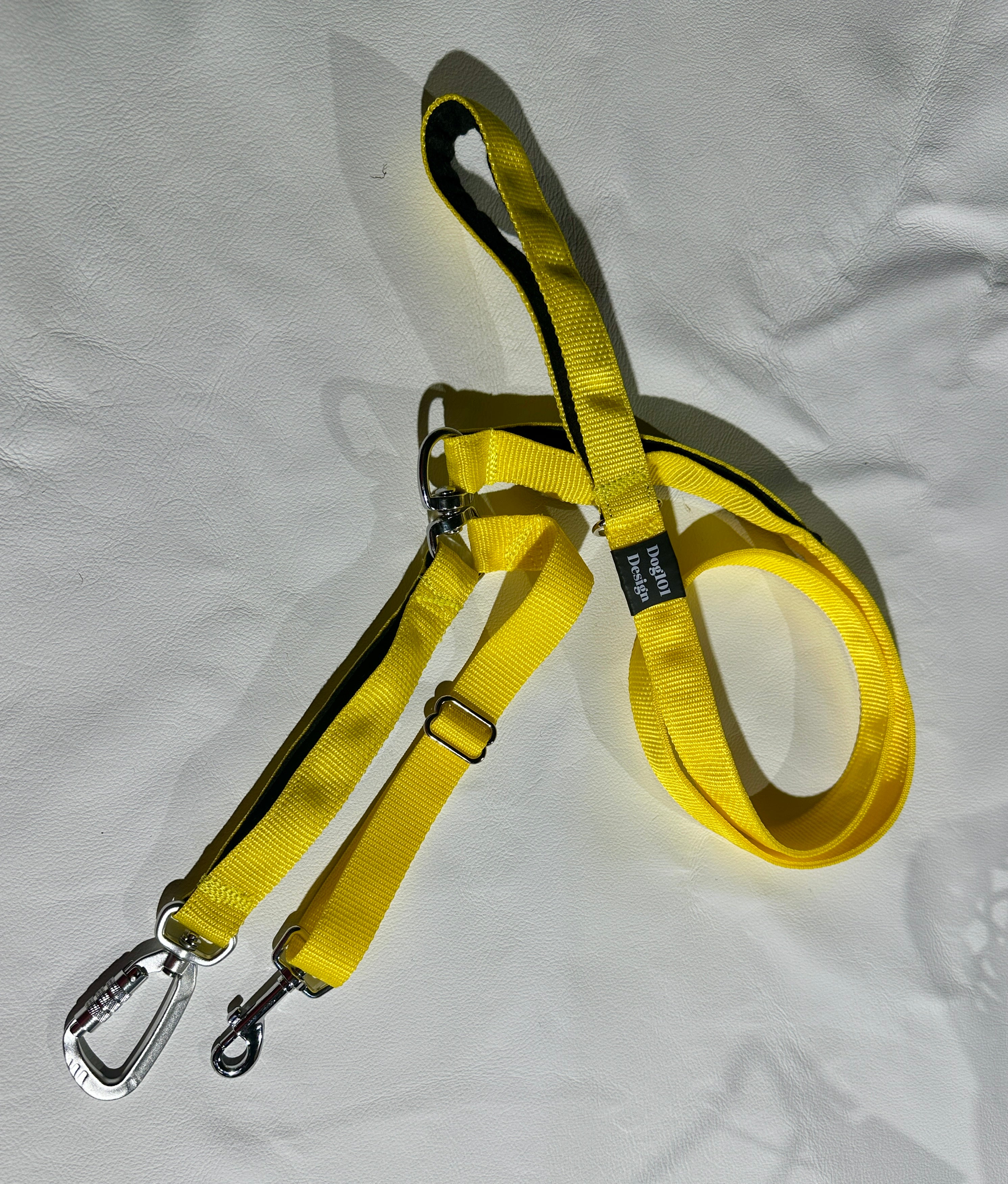 Our Dog101 Design reactive lead is designed to give you control and help when you need it.  The main clip is a screw locking clip so you cannot accidentally undo it.  It is connected to a swivel so the first point cannot twist at the halter or training device.  There is a second attachment which can than be shortened or extended to reach harnesses or collars so that you always have 2 different points of connection.  There is the first felt lined handle close to the end for large dogs.  From here a swivel is attached just in case your dog loses it and spins around so the lead does not wrap around your hand.  Above this is a felt lined handle so you can get low down control on the lead.  At the end of the lead is a D ring and another felt lined handle.  These are made in Brisbane and designed based on how we train reactive dogs for clients to get control quickly and safely, or for those who want the extra safety of being extra connected. 1.5M long or 0.9M Long