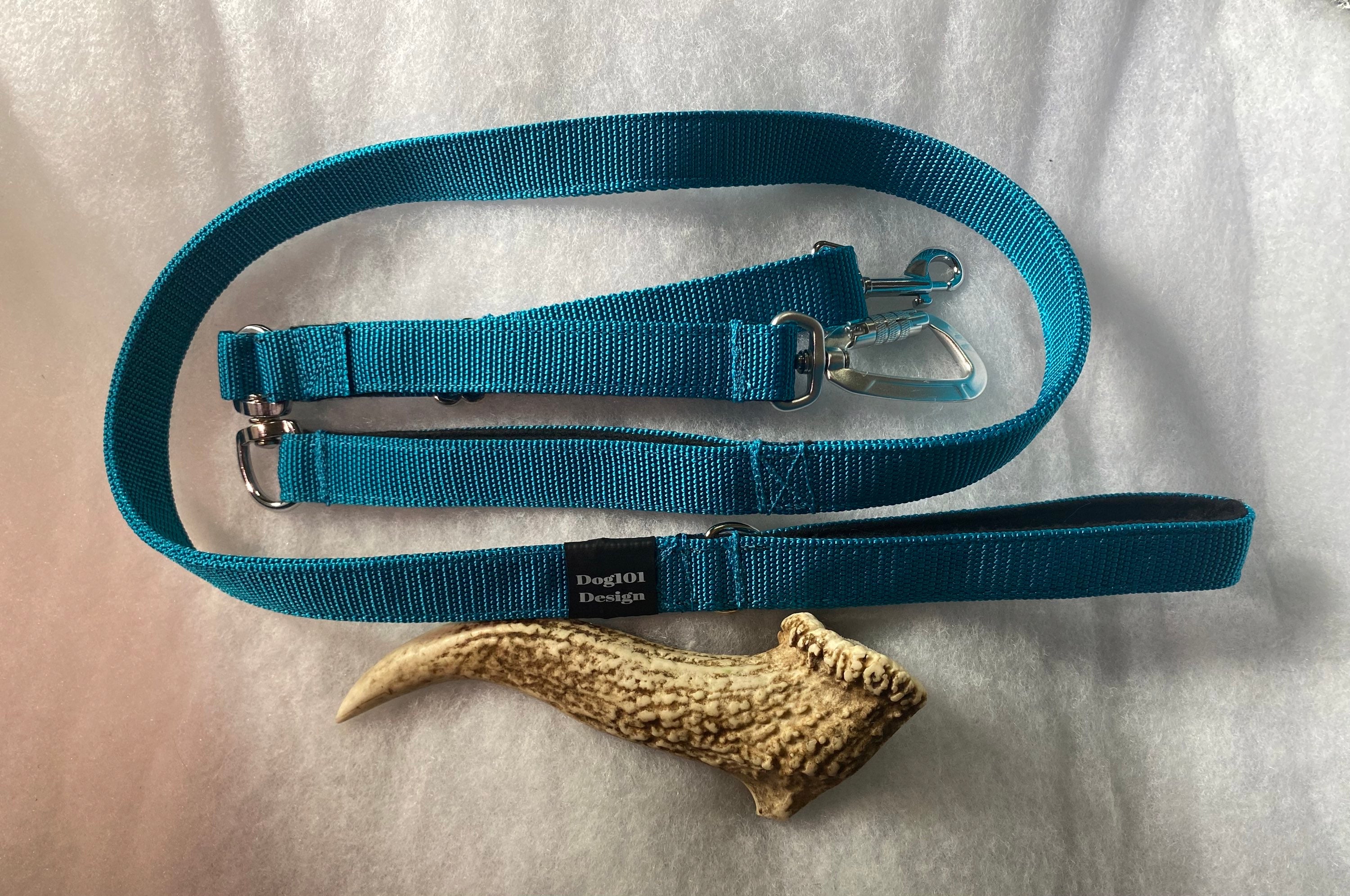Our Dog101 Design reactive lead is designed to give you control and help when you need it.  The main clip is a screw locking clip so you cannot accidentally undo it.  It is connected to a swivel so the first point cannot twist at the halter or training device.  There is a second attachment which can than be shortened or extended to reach harnesses or collars so that you always have 2 different points of connection.  There is the first felt lined handle close to the end for large dogs.  From here a swivel is attached just in case your dog loses it and spins around so the lead does not wrap around your hand.  Above this is a felt lined handle so you can get low down control on the lead.  At the end of the lead is a D ring and another felt lined handle.  These are made in Brisbane and designed based on how we train reactive dogs for clients to get control quickly and safely, or for those who want the extra safety of being extra connected. 1.5M long or 0.9M Long