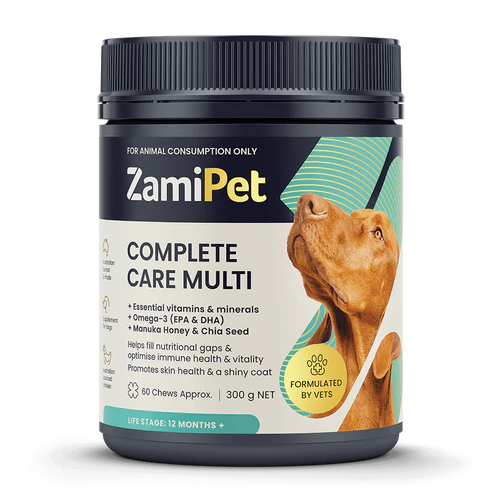 ZamiPet Complete Care dog multivitamin chews are a great tasting, breakable chew containing a comprehensive blend of vitamins and minerals plus Omega-3, Manuka Honey, Turmeric, CoQ10 and Prebiotic to maintain general health and vitality in dogs.